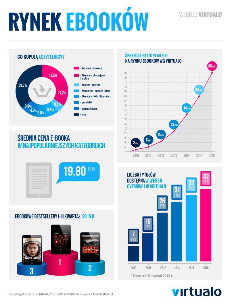Porównując sprzedaż ebooków sprzed 5 lat, kiedy wynosiła ona 2 mln złotych netto, z naszą prognozą na 2015 rok ze sprzedażą na poziomie 60 mln złotych – widać, że polski rynek e-książki ma nadal bardzo duży potencjał – mówi Robert Rybski, Prezes Virtualo. Duży wpływ na rozwój rynku ma rosnąca popularność nowoczesnej, mobilnej formy czytania, ale również z roku na rok coraz większa i bardziej atrakcyjna oferta dla eczytelników. – dodaje Robert Rybski.